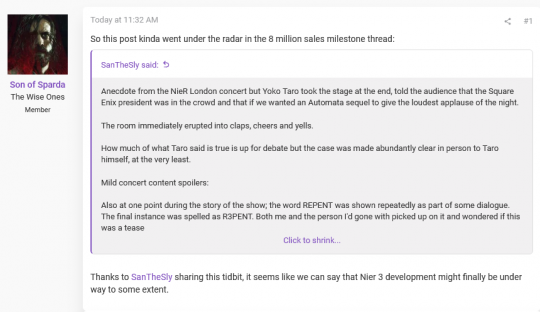 然而续作是否确有其事以及横尾太郎说的话的真实性依然有待商榷。这位用户还透露了另一个可能暗示《尼尔3》的线索,表示在音乐会期间的某个节目中,英文“REPENT(悔改)”一词作为台词多次出现,然而在最后一次中,这个词被拼写为“R3PENT”,用数字“3”代替了“E”。他和一起前往的朋友都注意到了这一点。